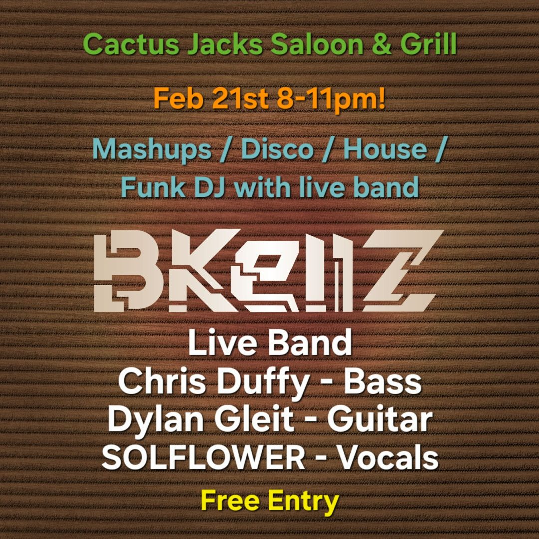 Time2Fly Music Presents – BKellz live band featuring Chris Duffy, Dylan Gleit & Solflower at Cactus Jack’s saloon for a free show from 8-11pm!
