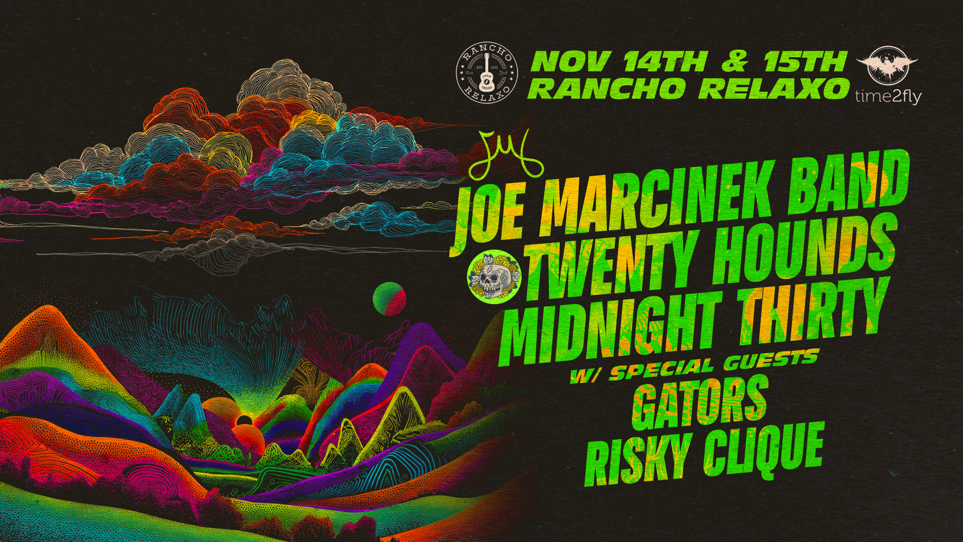 Live music, camping, community, and jamily vibes at Rancho Relaxo Nov 15th featuring Joe Marcinek Band, Grateful Dead Tribute ‘Twenty Hounds’, and Gators